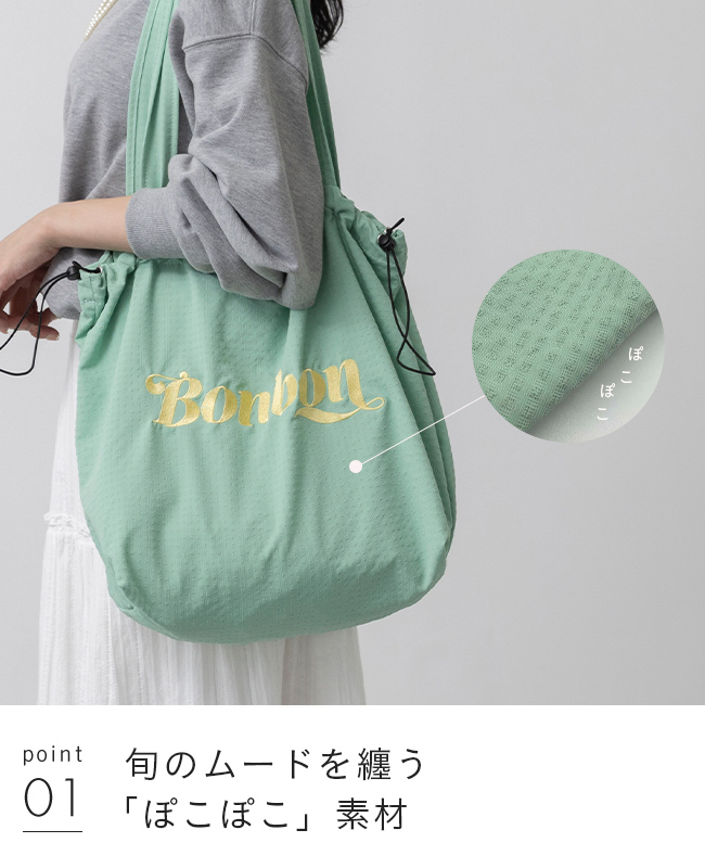 トレンドの凹凸感がある生地を採用し、春夏にぴったりの軽やかで大人かわいい質感を楽しめるトートバッグに仕上げました。