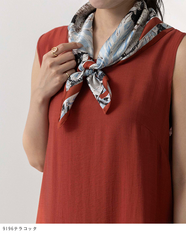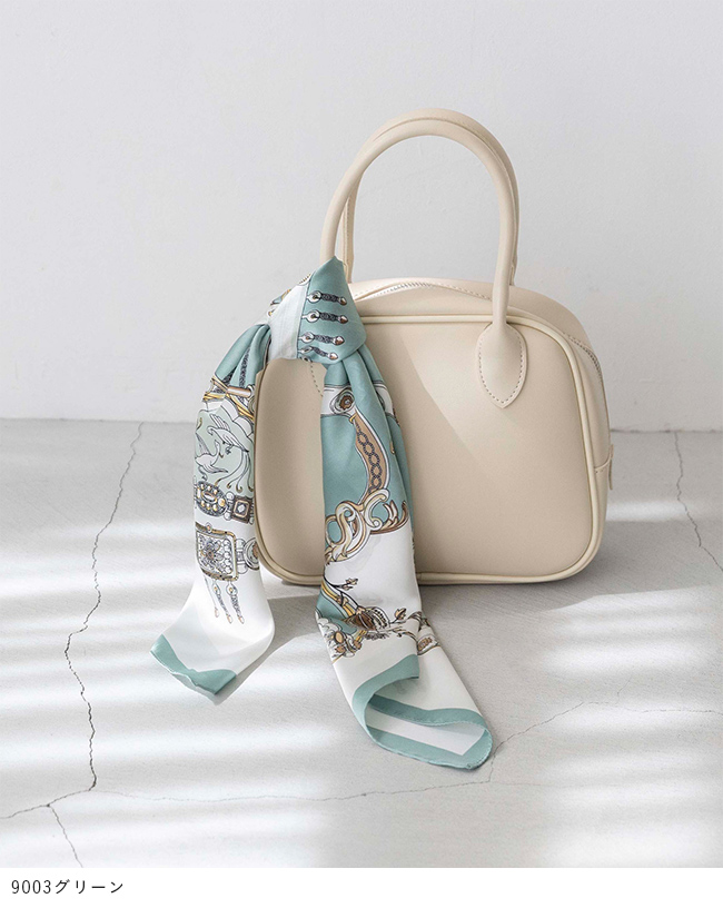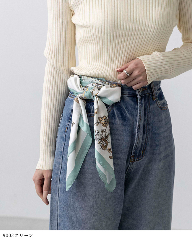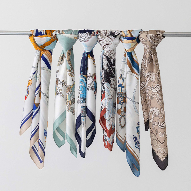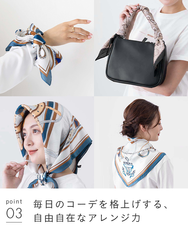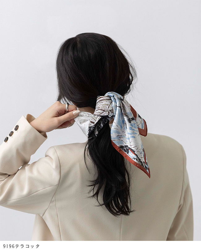 襟元にコンパクトに結んで顔周りを華やかにしたり、バッグのハンドルに巻いてアクセントにしたりと使い道は無限大。