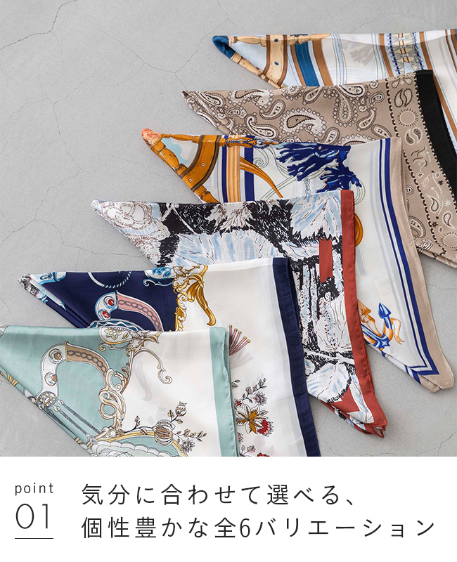 全6種類の多彩なバリエーションから選べるスカーフが、毎日のスタイリングにこなれ感をプラス!
