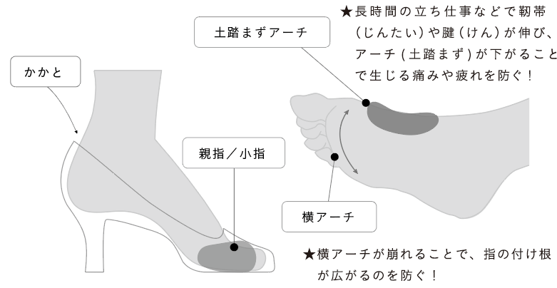 | 横アーチクッション | 指の付け根のアーチを支える | 横アーチが崩れ、指の付け根付近が痛むとき(パンプスやヒール着用時) |